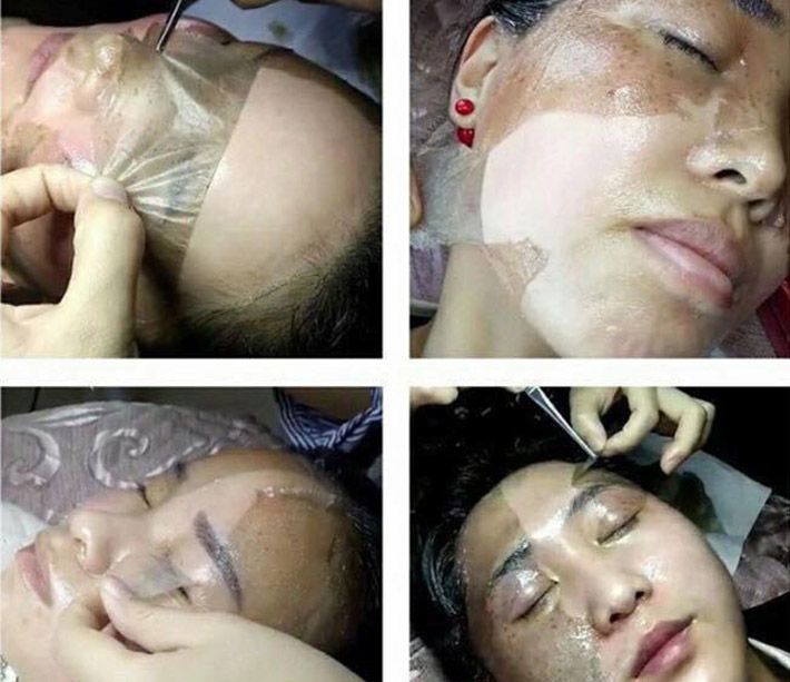 Bước 6: Lấy thìa cà phê ngoáy đều và lấy 1 lượng nhỏ màng nguyên sinh thoa đều lên khắp mặt, sau 10 phút có thể bôi thêm lớp 2 để lượng màng được tán đều và đủ độ dày trên mặt kết hợp với chiếu ánh sáng xanh. Sau 30-40 phút màng có dấu hiệu sạm lại có nghĩa độc tố đã được hút và tái tạo.