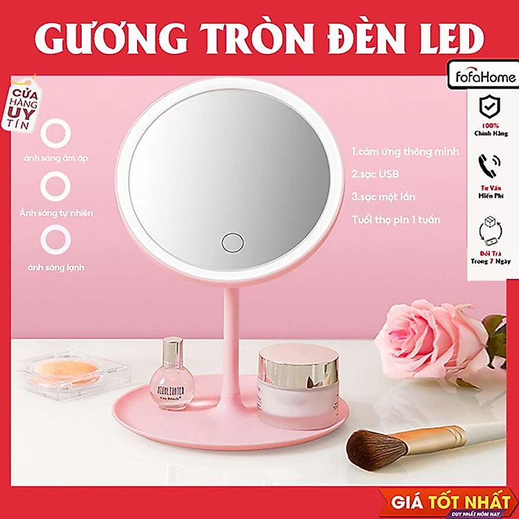 Gương Trang Điểm Để Bàn Có Đèn LED Cao Cấp Bằng Nhựa Hình Tròn Trắng Hồng Pin Bền Sạc Nhanh Tặng Cáp Sạc Giao Màu Ngẫu Nhiên