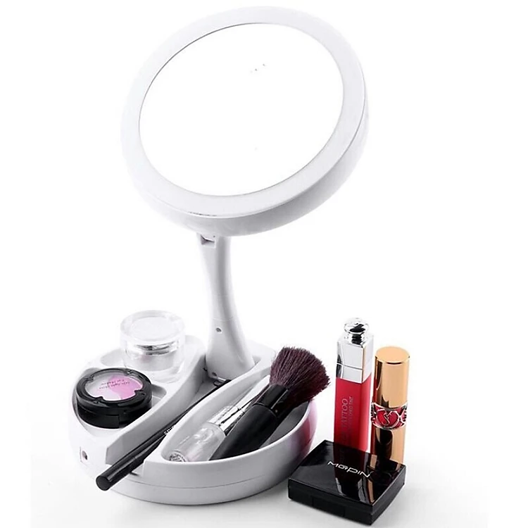 Gương trang điểm để bàn được thiết kế phù hợp cho các chị em trang điểm mọi lúc mọi nơi. Tích hợp đèn LED siêu sáng ở cả hai mặt. Một mặt có chế độ phóng đại 10 lần, giúp các chị em trang điểm các bộ phận trên mặt dễ dàng hơn.