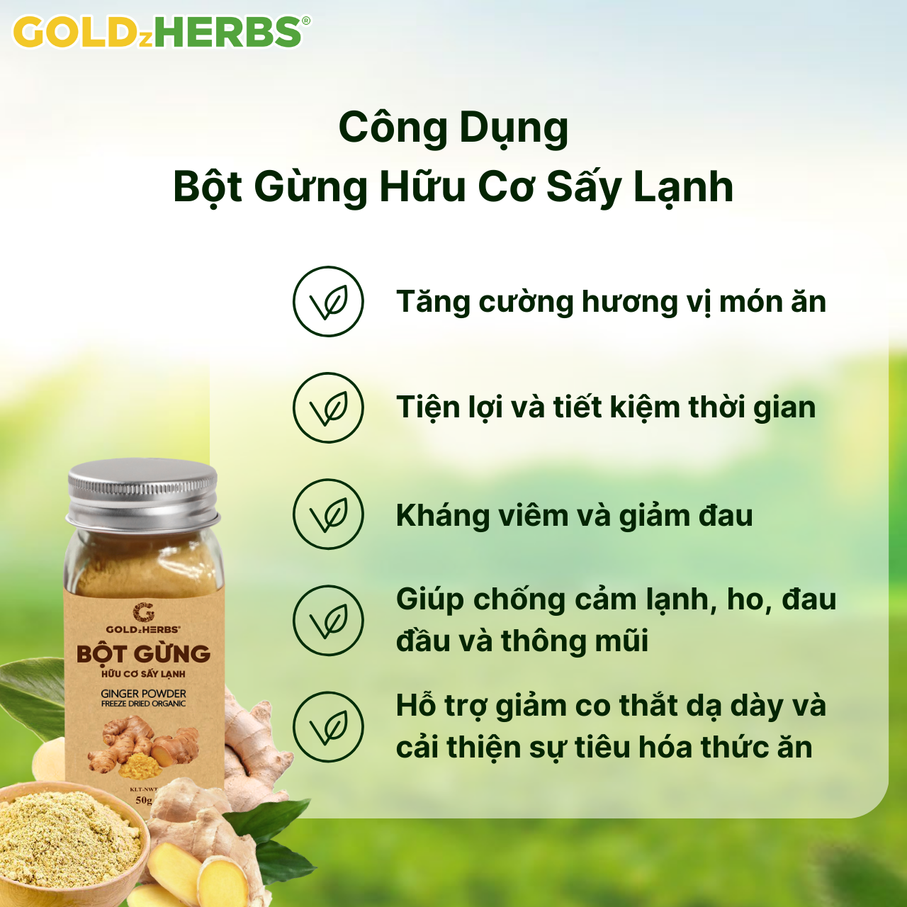 Bột Gừng Hữu Cơ Sấy Lạnh Goldzherbs được làm từ 100% Gừng sẻ Cao Nguyên trồng thuần tự nhiên được sấy theo công nghệ sấy lạnh với nhiệt độ thấp giữ được hương vị và dinh dưỡng vốn có của gừng tươi.