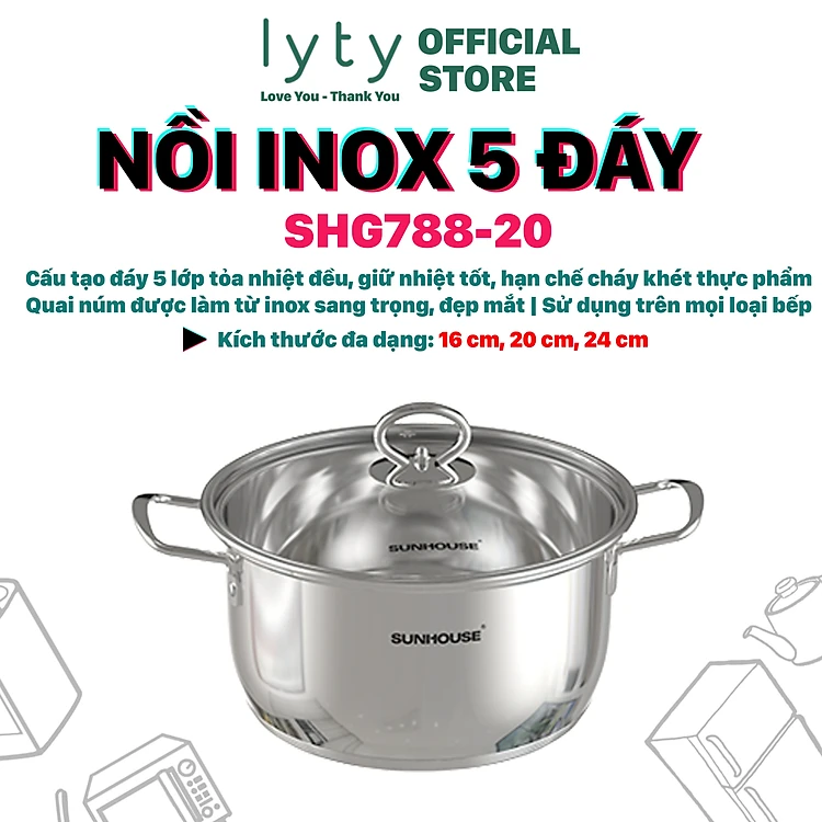 [Hàng Chính Hãng] Nồi Inox 5 Đáy Sunhouse SHG788 - Sử dụng được mọi loại bếp - Kích thước đa dạng 16cm, 20cm, 24cm