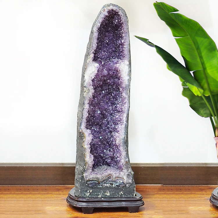 Hang Đá Thạch Anh Tím Amethyst Phong Thủy Đế Gỗ Tự Nhiên 74x18x20cm