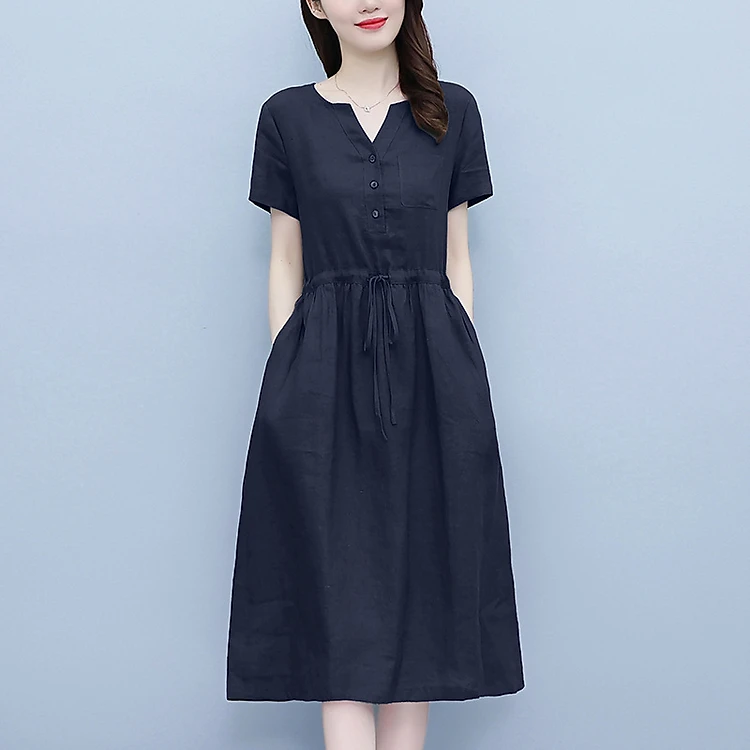 Đầm linen Nữ thiết kế cổ V Trẻ trung Kèm Dây Rút eo
