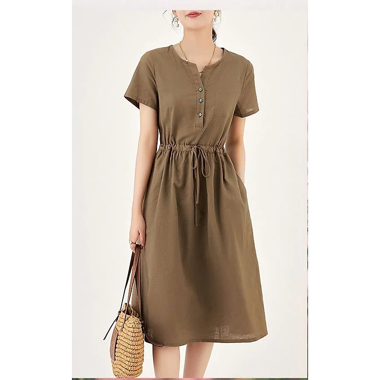 Đầm cao cấp Đũi Việt thiết kệ cổ V và dây rút sang trọng, trẻ trung da218