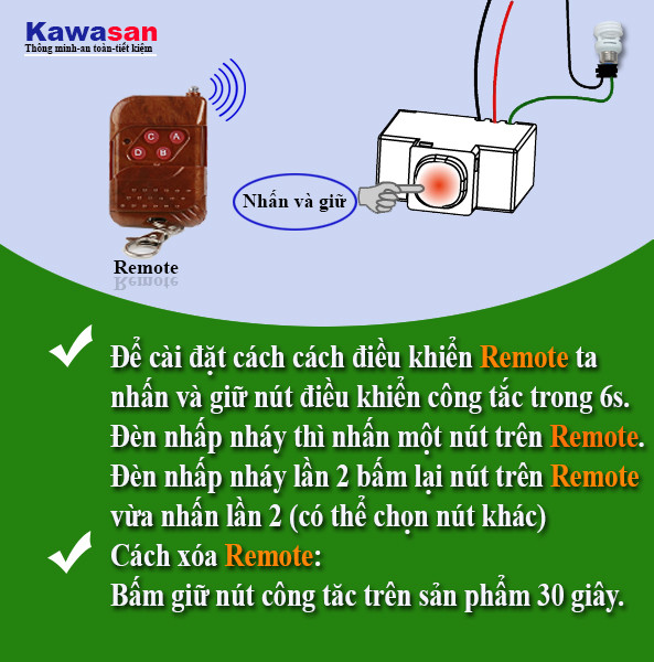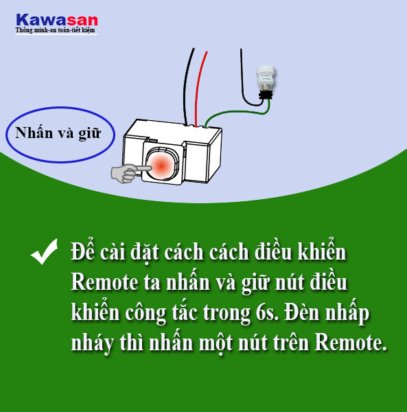 Lắp thiết bị và đấu điện cấp cho thiết bị, bấm nút trên thiết bị trong thời gian 3 giây, đèn trên nút nhấn nhấp nháy lần 1, bắt đầu tự chọn và bấm 1 phím bất kỳ trên remote TV để điều khiển, khi đã nhận tín hiệu đèn nhấp nháy lần 2 thì bắt đầu bấm lại phím lần 2 phím này sẽ được nhớ trong thiết bị và được sử dụng nút này để điều khiển tắt mở thiết bị.