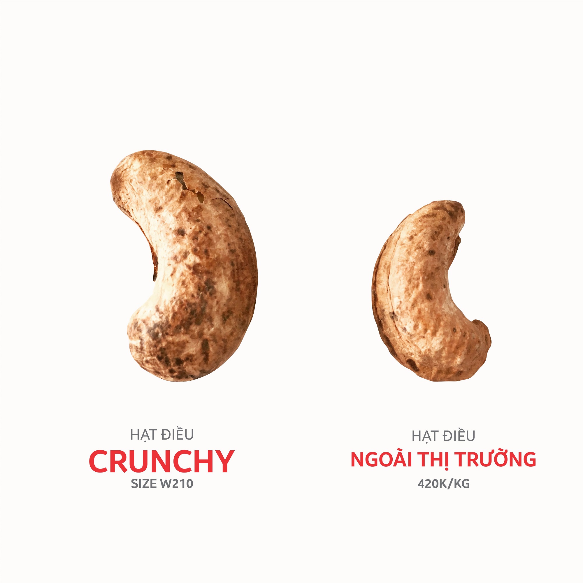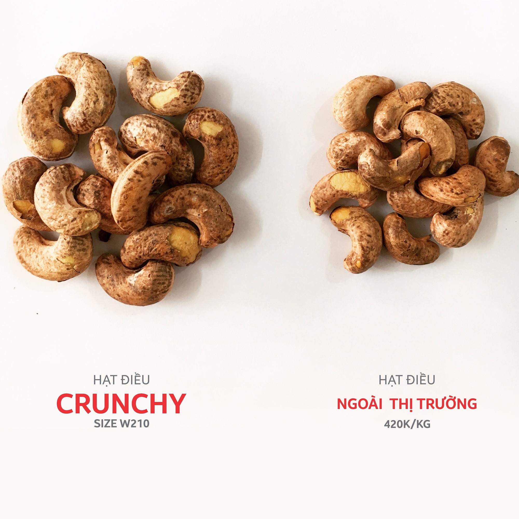 Hạt điều Crunchy vị béo tự nhiên do được sản xuất từ những hạt điều mẩy, mập, to tròn, là những hạt đủ tuổi, đủ dinh dưỡng nhất của dòng hạt điều thuần chủng Việt Nam. Size hạt điều đạt tiêu chuẩn cao nhất W210 (210 hạt/pound, điều này có nghĩa là W số càng nhỏ, thì hạt càng to, W210 sẽ có hạt to hơn hẳn W320), thuộc loại cao cấp nhất. Thông thường các loại hạt điều trên thị trường chỉ có kích cỡ tối đa khoảng W320. Hãy thưởng thức những miếng cắn giòn rụm của hạt điều cao cấp Crunchy của The Kaffeine - HẠT KHỔNG LỒ - GIÁ TÍ HON