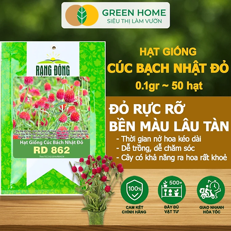 Hạt Giống Hoa Cúc Bách Nhật Đỏ GreenHome, Gói 0,1g~50 hạt, Dễ Trồng Quanh Năm, Ra Hoa Liên Tục H16