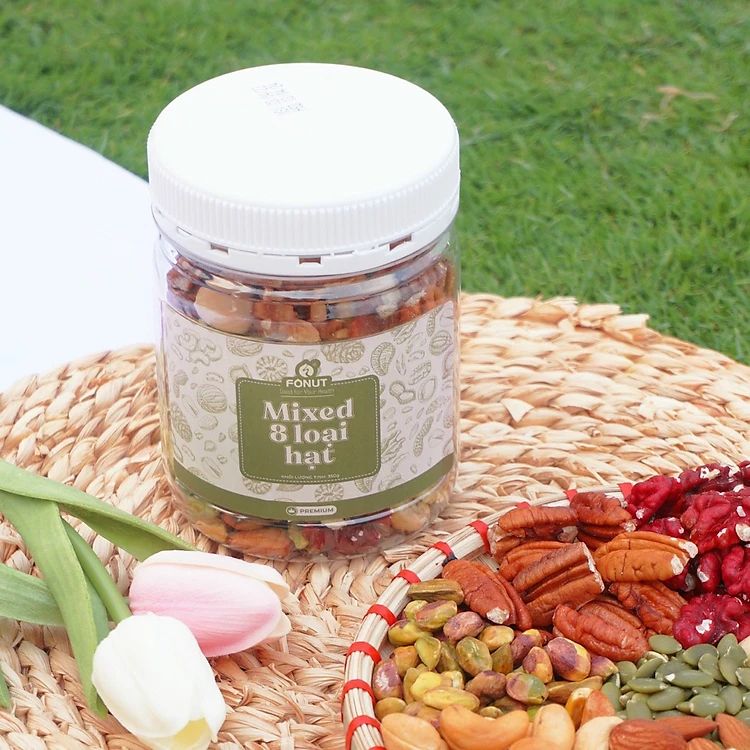 Hạt mix 8 loại hạt dinh dưỡng (Hạt macca, óc chó vàng, óc chó đỏ, hồ đào, hạnh nhân, hạt dẻ cười, hạt điều, bí xanh) Hộp 350gr