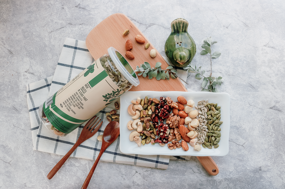 Bao gồm 8 loại hạt nhập khẩu: - nhân hạt óc chó vàng - nhân hạt óc chó đỏ - hạnh nhân - macca - hạt điều - hạt bí - hướng dương - hạt dẻ cười Đây là một lựa chọn thông minh khi bạn muốn sử dụng đa dạng các loại hạt, rất ngon miệng và giàu dinh dưỡng