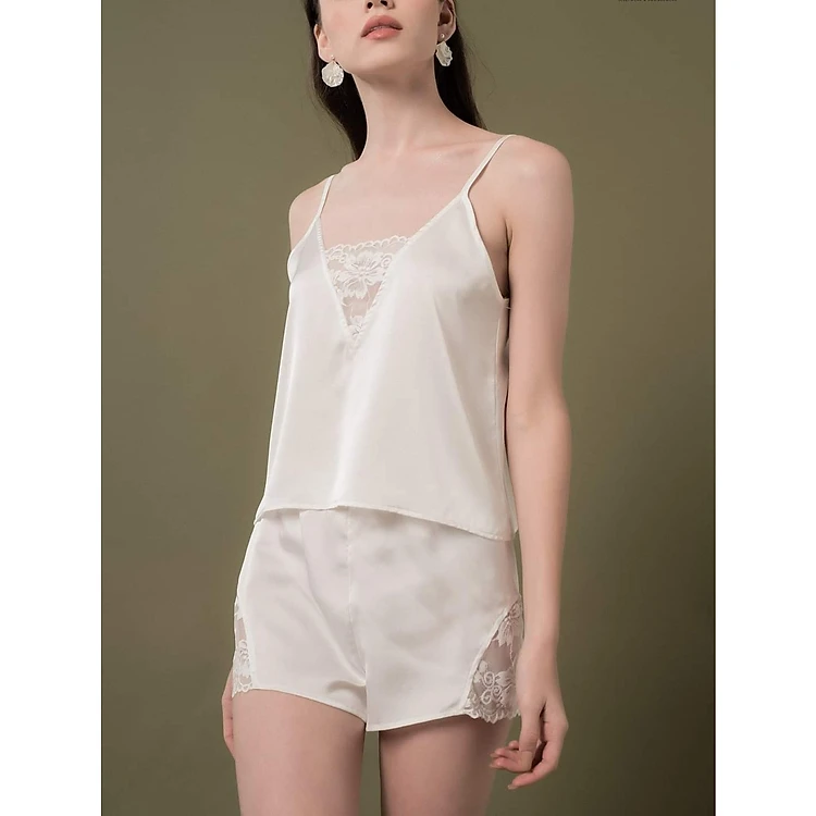 Bộ đồ ngủ lụa áo hai dây tạo điểm nhấn với vạt áo phối ren đen sang chảnh, mềm mại.