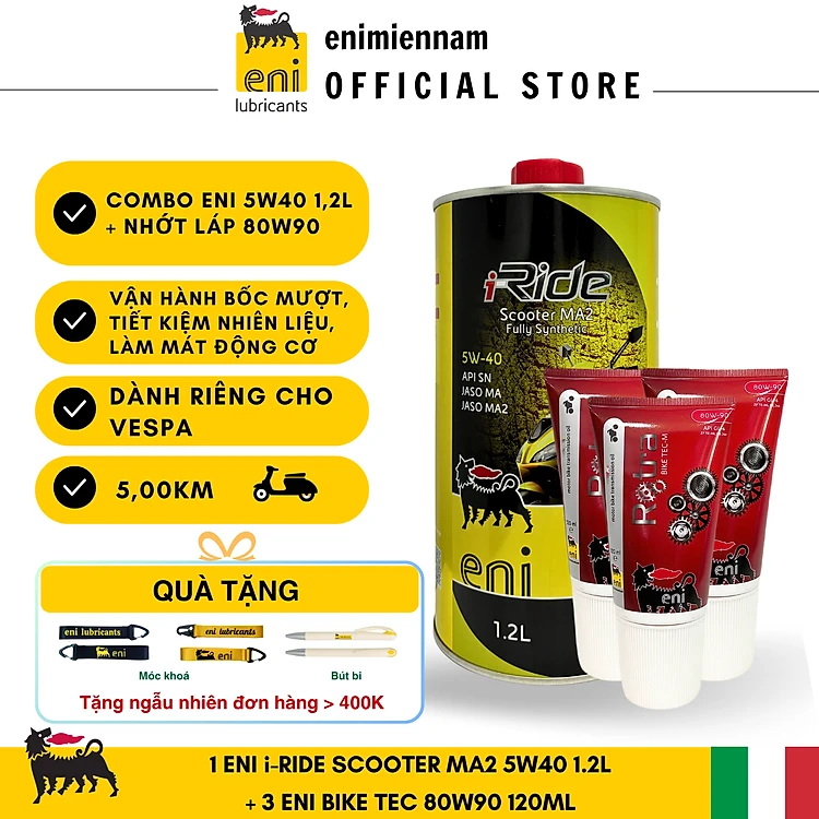 (HCM) Combo Eni Scooter MA2 5W40 1.2L +3 Nhớt Lap Eni Bike Tec 80W90 120ml