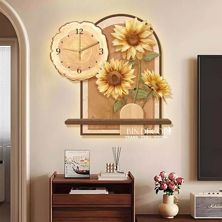 (HCM) Tranh đồng hồ đèn led tráng gương hoa hướng dương 6 trang trí phòng khách,phòng ngủ