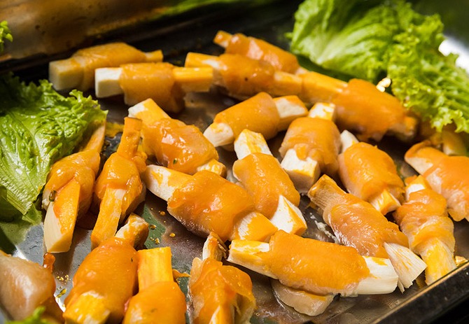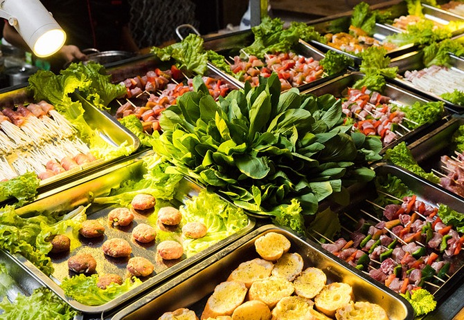 Bất ngờ hơn, bữa tiệc buffet lần này còn có những món mới lạ, chắc chắn sẽ khiến những người sành ăn thích thú, như: thịt nai, thịt đà điểu được tẩm ướp với sa tế hoặc cuộn nấm kim châm, cuộn cải mầm, xiên rau củ… Bên cạnh đó, bạn cũng bắt gặp nhiều món ăn quen thuộc trong bữa cơm hàng ngày của người Việt cũng được xuất hiện trong thực đơn lần này như: cá kèo, cá hú, cá diêu hồng, cá lóc, ếch nướng muối ớt, ếch nướng ngũ vị, gà cuộn lá chanh, đùi gà nướng, gà phi lê cuộn nấm đùi gà,…