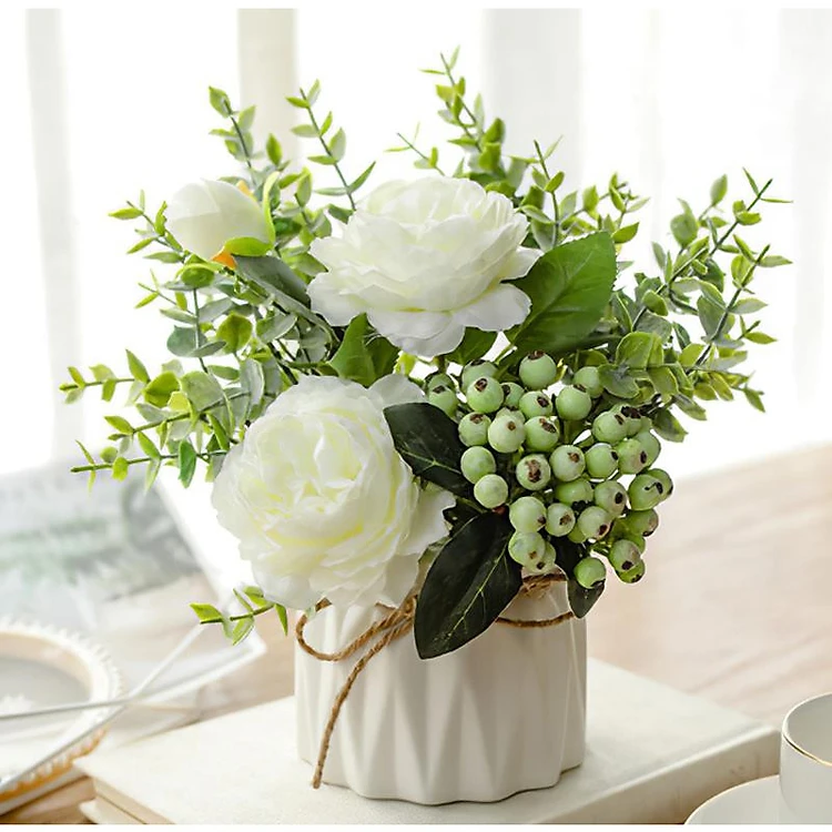 Hoa lụa, chậu hoa mẫu đơn điểm quả thảo để bàn trang trí quán cà phê, bàn làm việc sang trọng, lọ hoa decor phòng khách đẹp