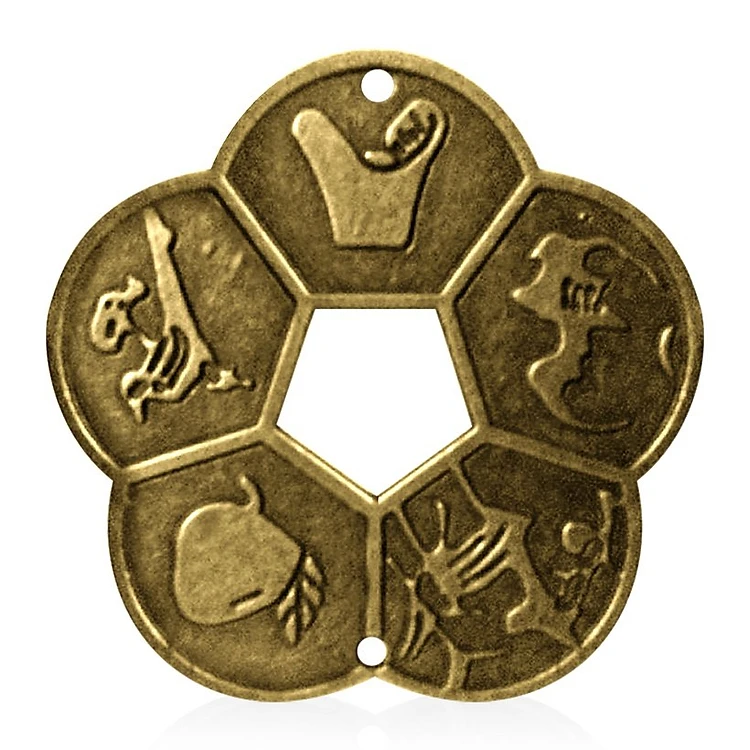 “Hoa mai kim tiền” có công dụng rất phổ biến là giải trừ tiểu nhân, tránh thị phi. Ngoài ra, tiền hoa mai còn mang một số ý nghĩa đặc biệt. “Mai hoa kim tiền” là đồng tiền bằng đồng hình hoa mai năm cánh. Một mặt chạm “ngũ tự” gồm : THỌ (sống lâu), MỆNH (số mạng), THỦ (đứng đầu), PHÚ (giàu có)và QUÝ (thăng tiến) trên mỗi cánh hoa. Mặt còn lại chạm hình ĐÀO TIÊN (trường thọ), CHIM KHÁCH (cát tường), THỎI VÀNG (của cải), DƠI (phúc) và TUẦN LỘC (lộc).