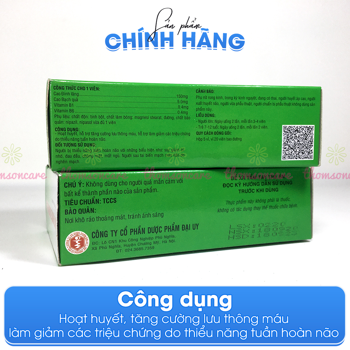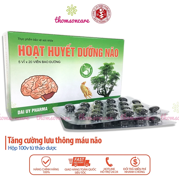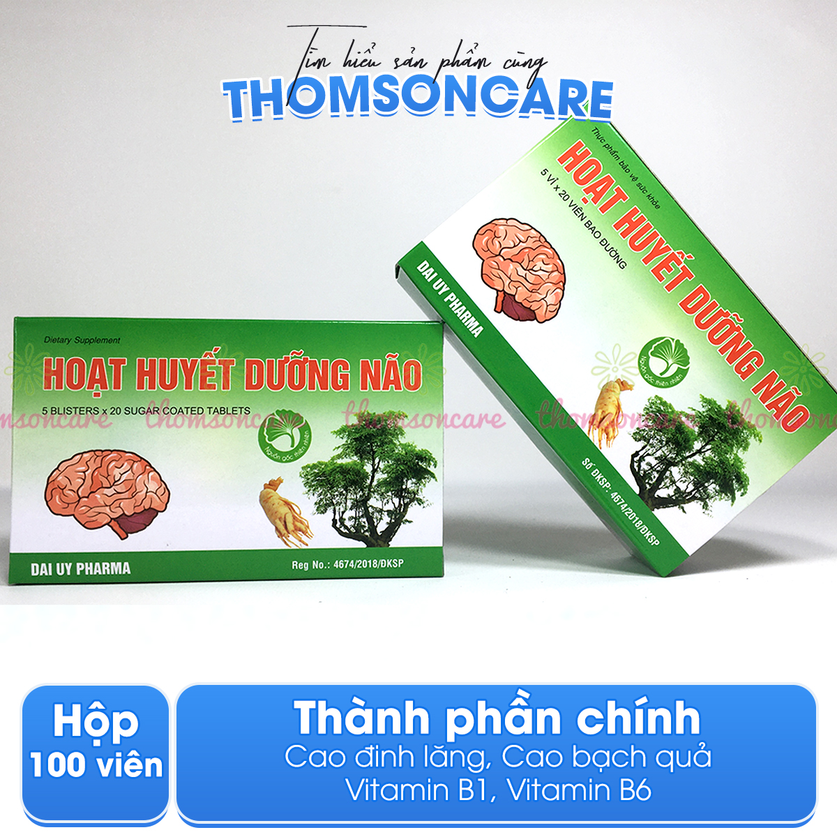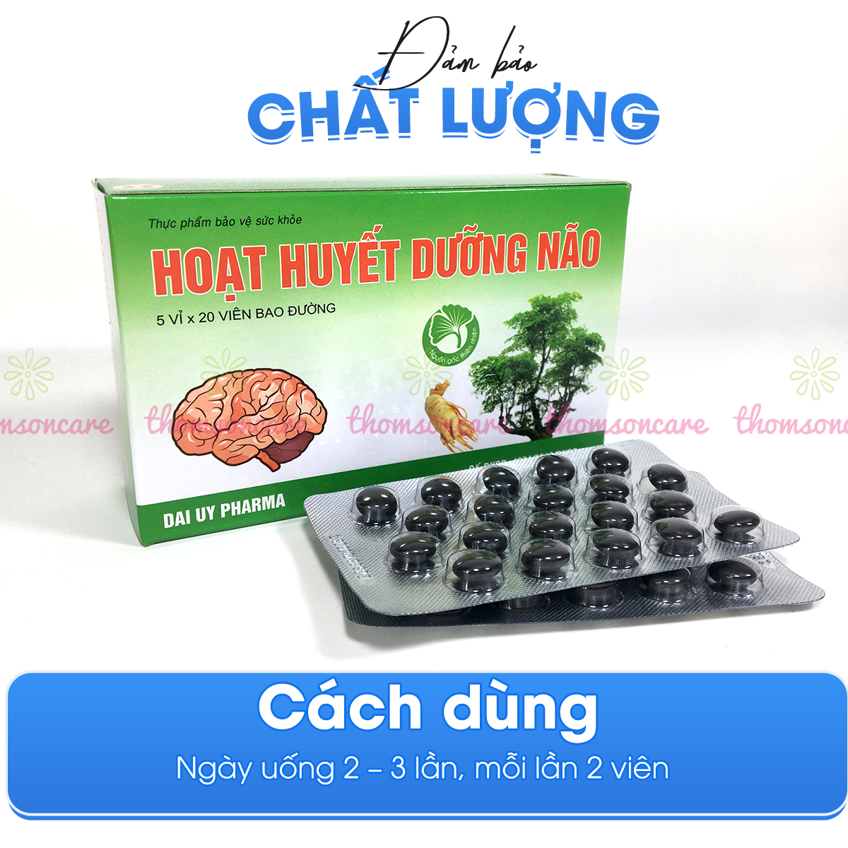 Hoạt huyết dưỡng não - Hộp 100 viên bao đường - tuần hoàn não, Dược Đại Uy, từ đinh lăng, bạch quả