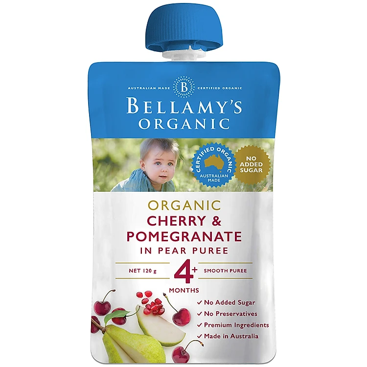 - Hỗn Hợp Trái Cây Nhiệt Đới: Lê, Cherry, Lựu Hữu Cơ Bellamy's Organic xay nhuyễn thuộc dòng sản phẩm túi trái cây đặc biệt hấp dẫn, không thêm đường cho bé thưởng thức