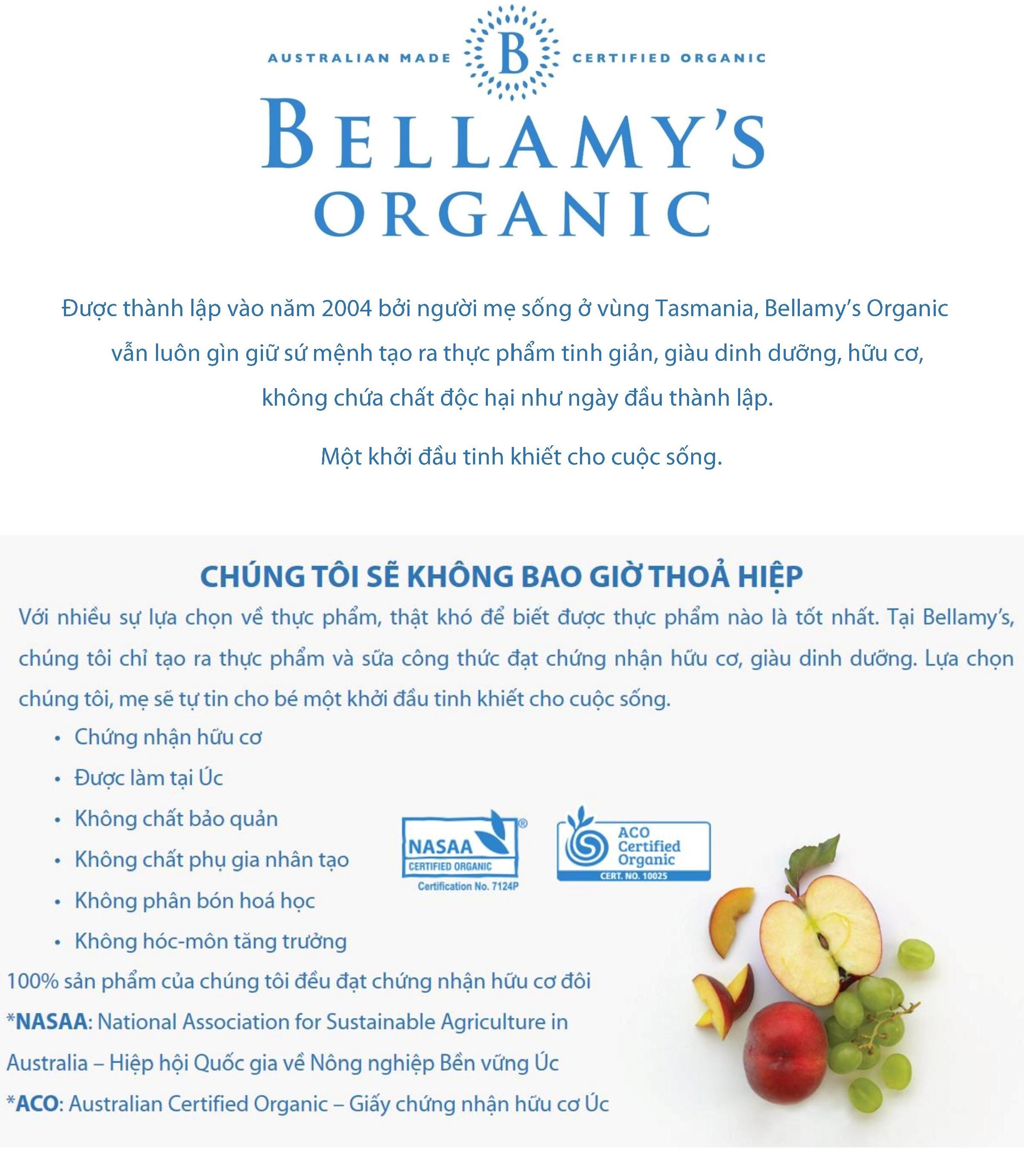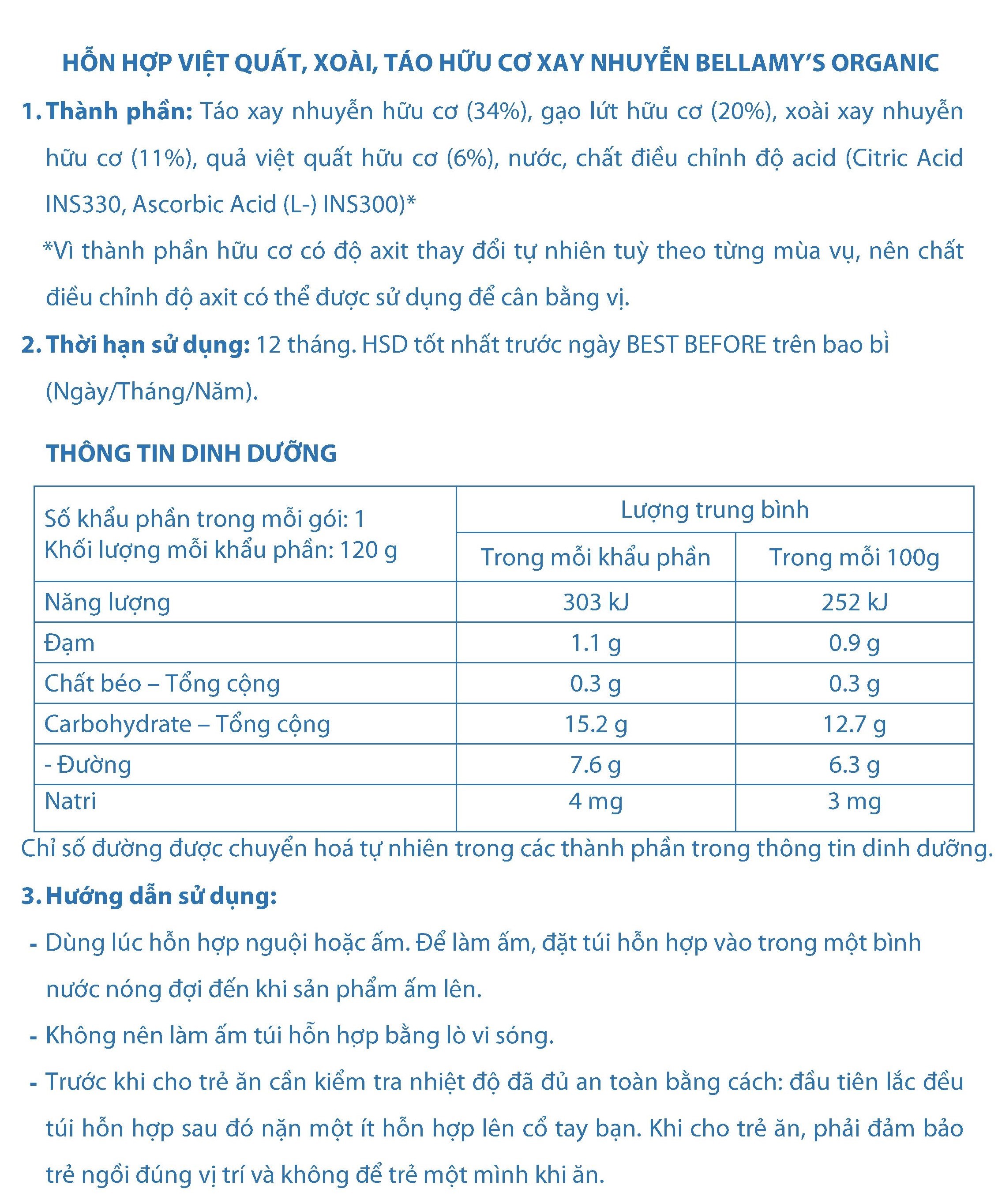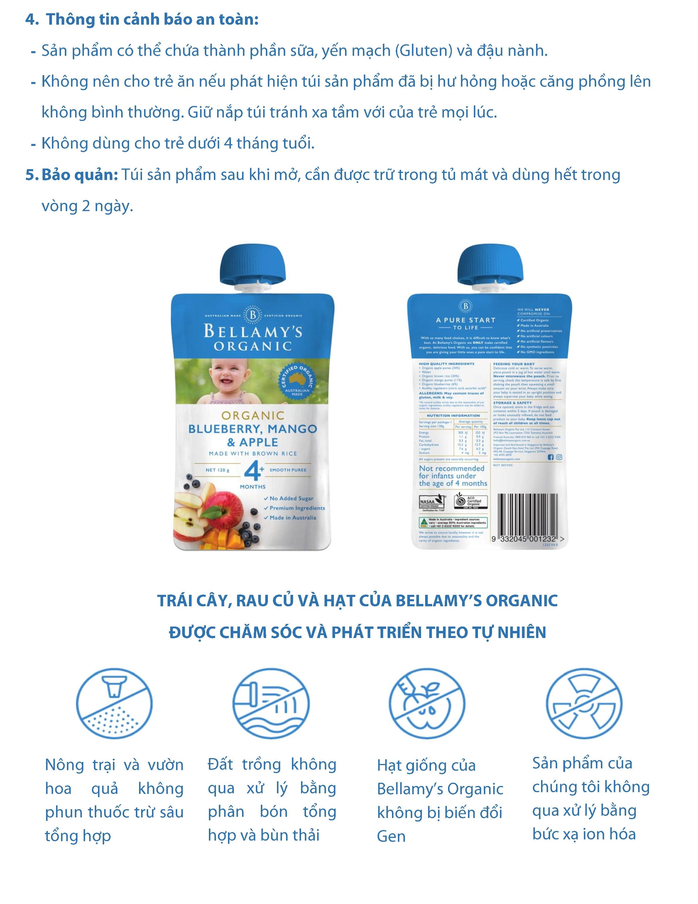 Thành phần táo hữu cơ 68%, xoài hữu cơ 13%, Việt quất hữu cơ 11%, gạo lứt hữu cơ 8%.