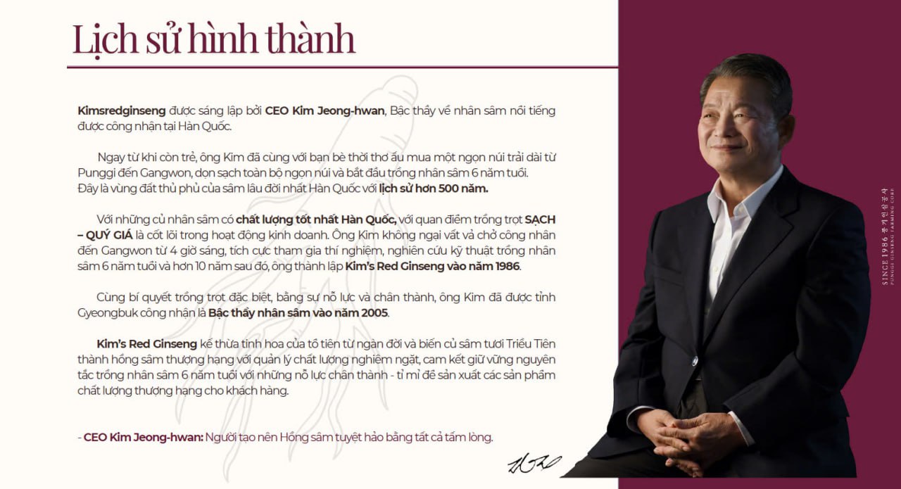 Kim's Red Ginseng là thương hiệu hồng sâm 6 năm tuổi với lịch sử 50 năm. Được sáng lập bởi Kim Jeong Hwan, Giám đốc điều hành của Tập đoàn nhân sâm Punggi và là một bậc thầy về nhân sâm Hàn Quốc