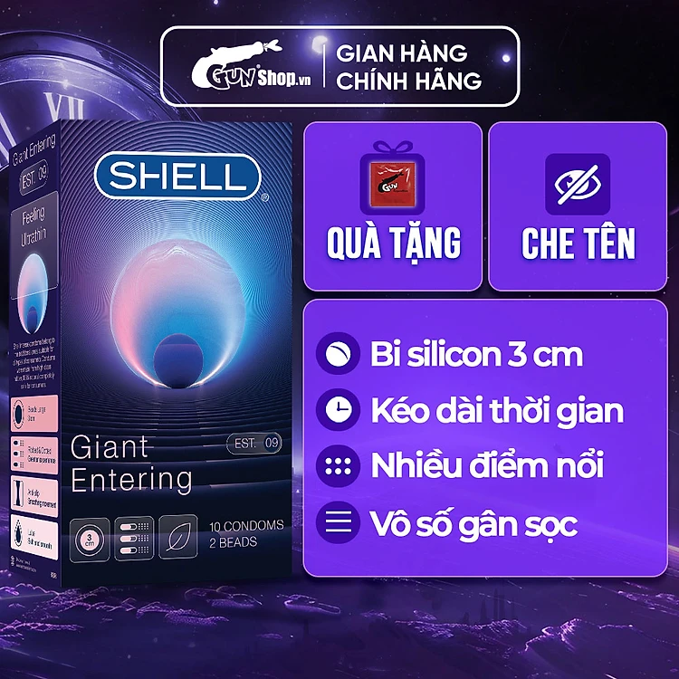 [Hộp 10 cái] Bao cao su Shell Giant Entering - Gân nổi, bi tăng 3cm