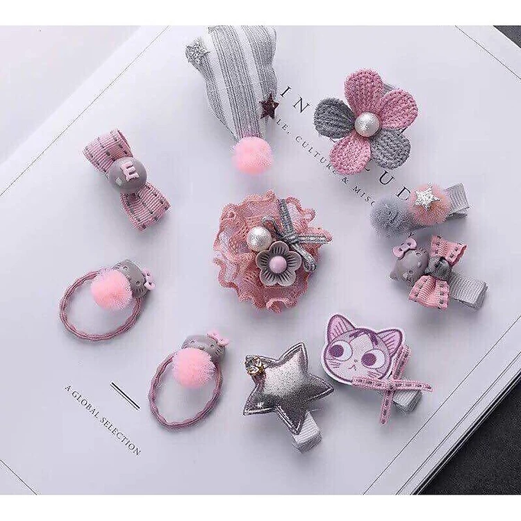 Gồm 10 món phụ kiện tóc họa tiết ngộ nghĩnh cho bé dễ phối cùng trang phục.