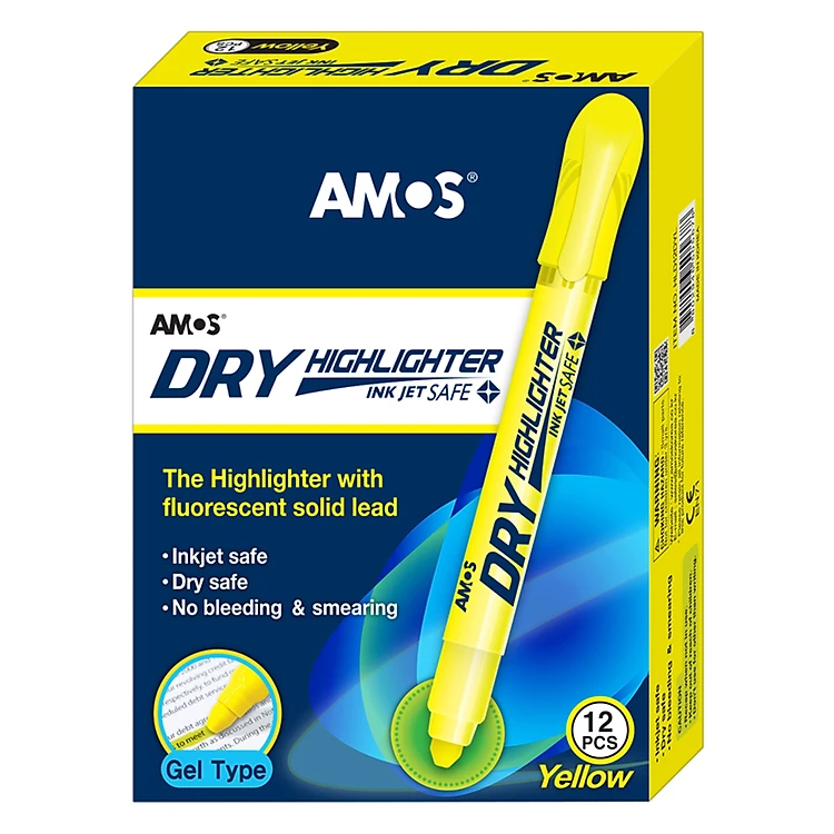 - Hộp 12 Bút Highlight Khô AMOS ADLH-Y - Vàng là dòng văn phòng phẩm được các em học sinh, sinh viên và giới văn phòng sử dụng rộng rãi, sản phẩm ít hao mực nhờ sử dụng mực dạng gel huỳnh quang, màu mực tươi sáng, làm nổi bật các dòng, các điểm cần lưu ý trong văn bản.