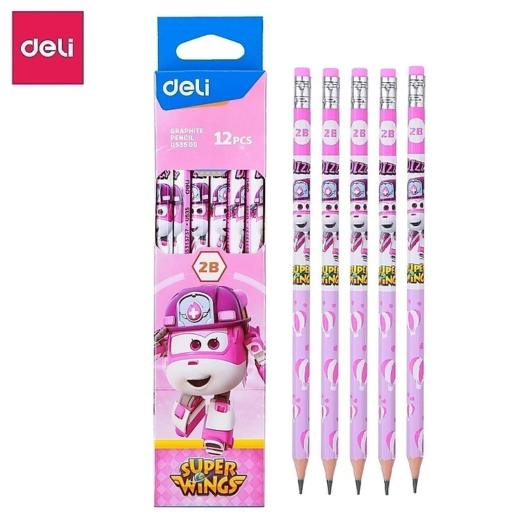 Hộp 12 cây bút chì đội bay siêu đẳng Superwings 2B Deli U535 kèm đầu tẩy Deli 53500