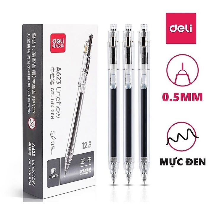 Hộp 12 cây bút gel nước học sinh mực đen ngòi 0.5mm Deli A623 / 623 mực nhanh khổ, vỏ màu trong suốt