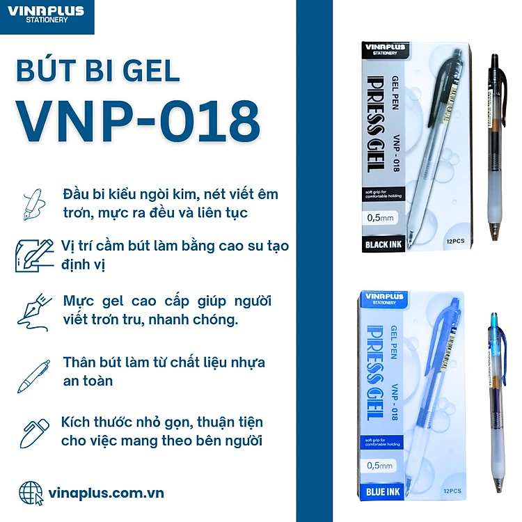 Bút Viết Gel Nước Dạng Bấm Vinaplus 018 Ngòi 0.5mm (Mực Xanh, Đen)
