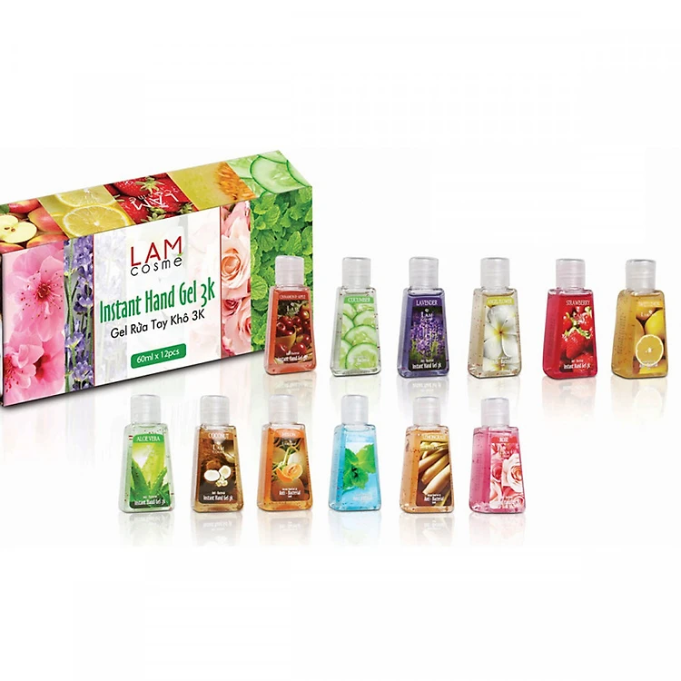 Hộp 12 Chai Gel Rửa Tay Khô 3K (60ml/ Chai) Lamcosmé Set Hoa Quả - Tặng Chai Nước Rửa Tay (500ml)