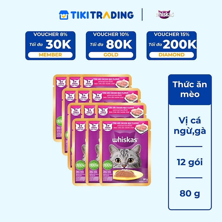 [Combo 12 Gói] Thức Ăn Cho Mèo WHISKAS 1+ years Vị Cá Ngừ, Gà 80g/Gói