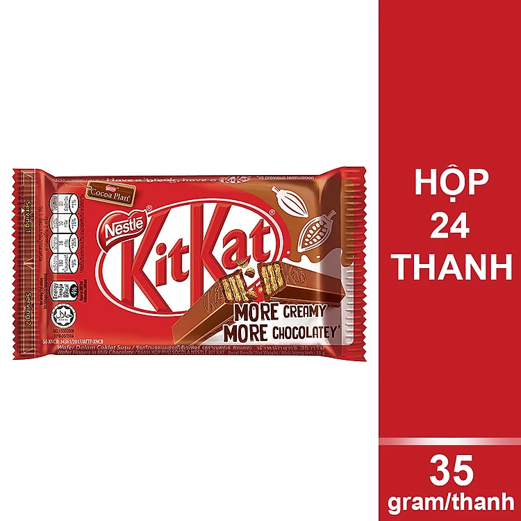 Sản phẩm được đóng gói riêng lẻ thành từng thanh với trọng lượng 35g, bạn có thể dùng ngay khi mở bao. Chocolate KitKat dần trở thành một trong những thương hiệu bánh kẹo rất nổi tiếng được nhiều người tin dùng.Giá sản phẩm trên Tiki đã bao gồm thuế theo luật hiện hành. Bên cạnh đó, tuỳ vào loại sản phẩm, hình thức và địa chỉ giao hàng mà có thể phát sinh thêm chi phí khác như phí vận chuyển, phụ phí hàng cồng kềnh, thuế nhập khẩu (đối với đơn hàng giao từ nước ngoài có giá trị trên 1 triệu đồng).....
