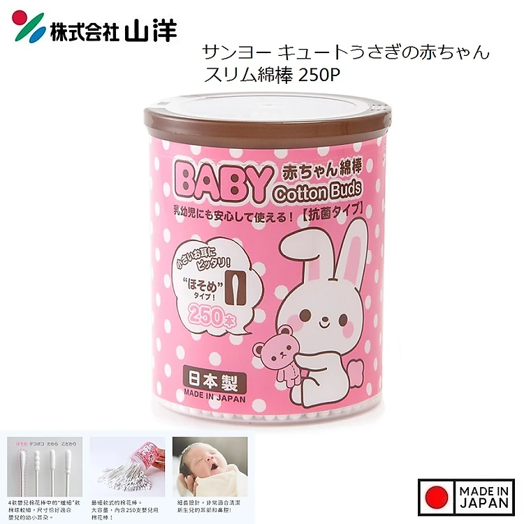 Hộp 250 tăm bông kháng khuẩn hình thỏ Sanyo, dùng để hỗ trợ rửa và vệ sinh mũi, tai, răng miệng hay làm vệ sinh cuống rốn cho bé - Hàng nội địa Nhật Bản | Made in Japan