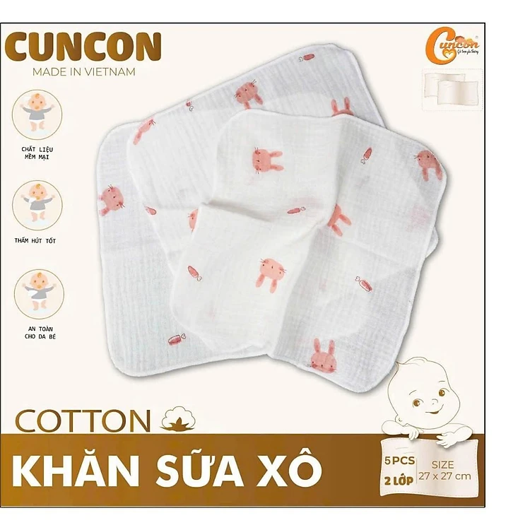 [Hộp 5 khăn] Khăn Sữa Xô Cotton 2 Lớp Mềm, Mỏng, Thấm Hút, Nhanh Khô Cho Bé Sơ Sinh - CÚN CON