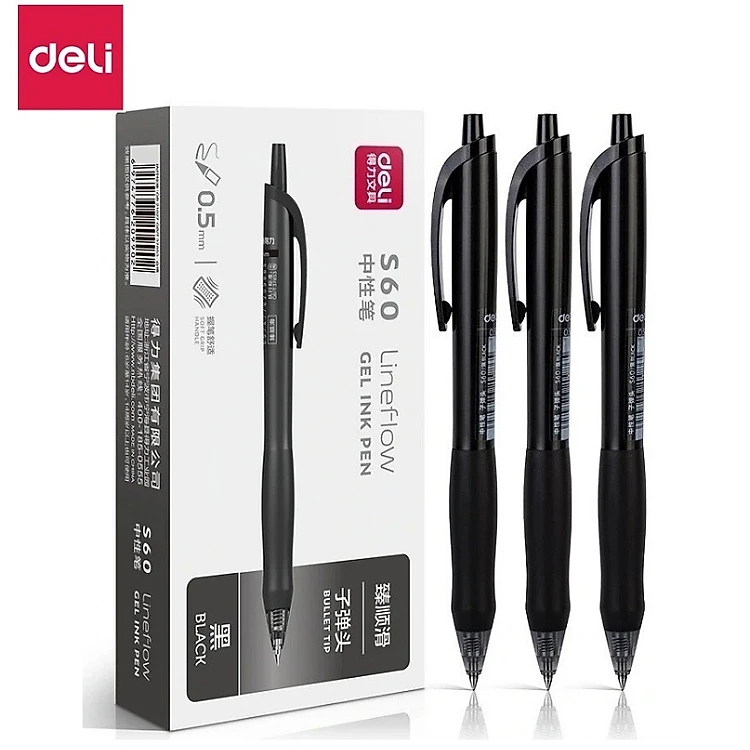 Hộp 6 bút gel nước học sinh mực đen ngòi 0.5mm Deli S60-6 / Bút gel Deli S60 ruột thay S206