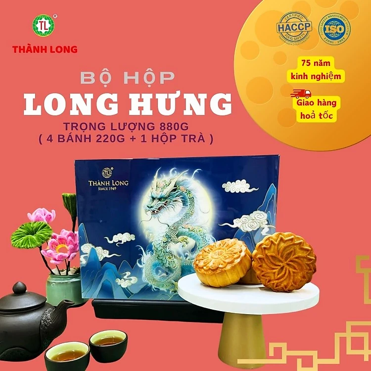 Hộp bánh trung thu cao cấp tráng gương 4 bánh 2 trứng 220g - Long Hưng - Thành Long 880g - Tặng 1 hộp trà - Việt Nam