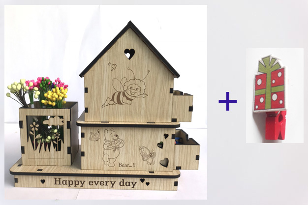 Hộp bút hình ngôi nhà dể thương, độc đáo mới lạ, được khắc laser sắc nét. mặt trước , sau đều giống nhau.