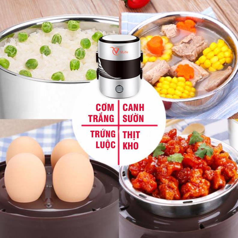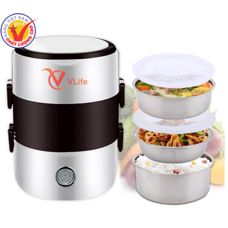 Hộp Cơm Điện Đa Năng VLIFE với 3 ngăn đựng thức ăn bằng inox 304. Hộp được thiết kế với nắp hút chân không chắc chắn giúp cho canh không bị đổ ra ngoài.
