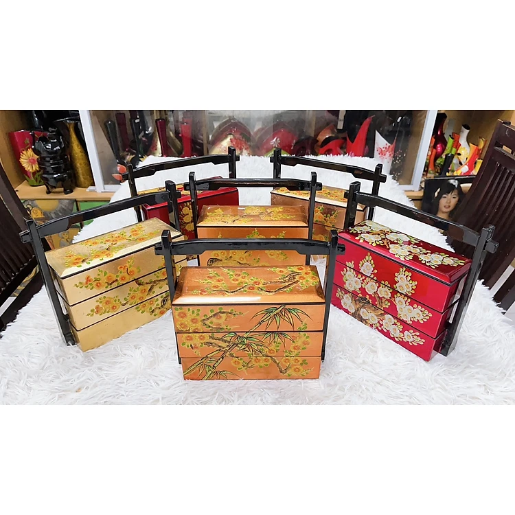 Hộp Cơm sushi sơn mài 3 tầng quai xách hàng vẽ đắp nổi cao cấp