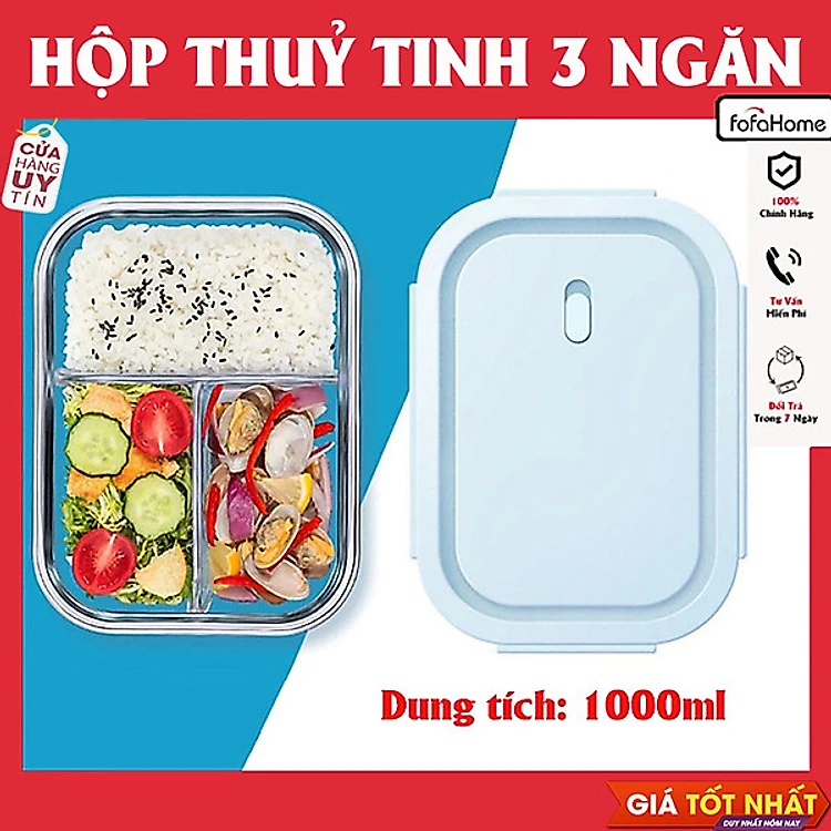 Hộp Cơm Thủy Tinh Cao Cấp 3 Ngăn Chịu Nhiệt Có Nắp Dung Tích 1000ml