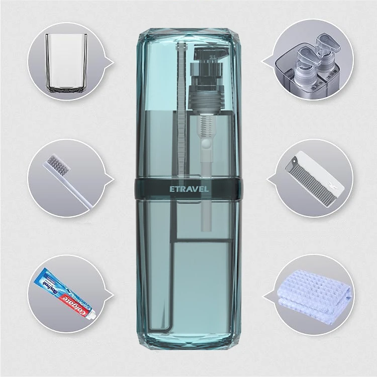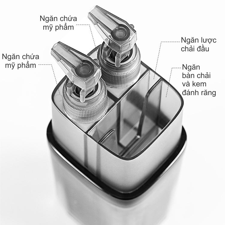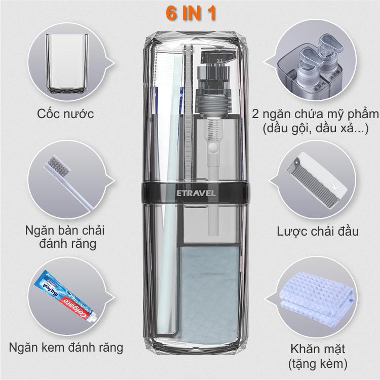 - Bộ sản phẩm gồm: Nắp trên kiêm ly đánh răng, lược, thân chính có 2 ngăn đựng chất lỏng có vòi xịt, ngăn khăn mặt (có sẵn khăn tơ) + ngăn đựng bàn chải & kem đánh răng (không gồm bàn chải & kem đánh răng).