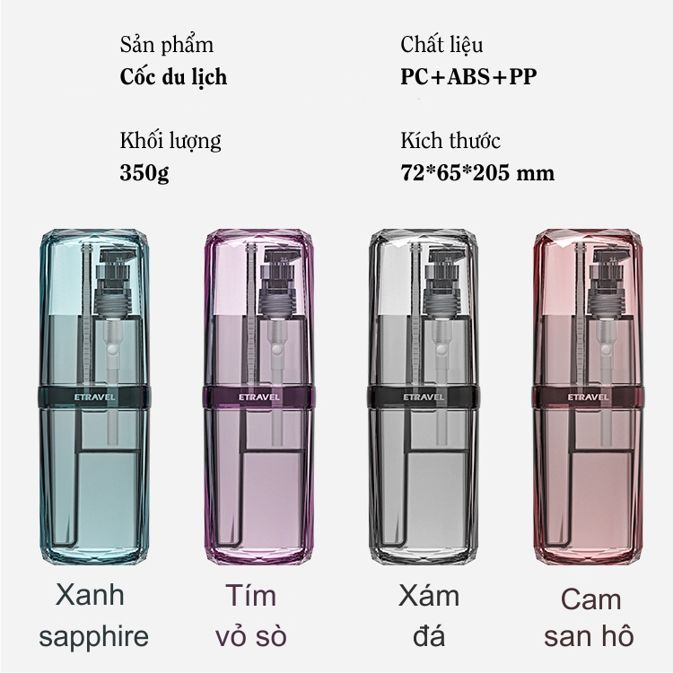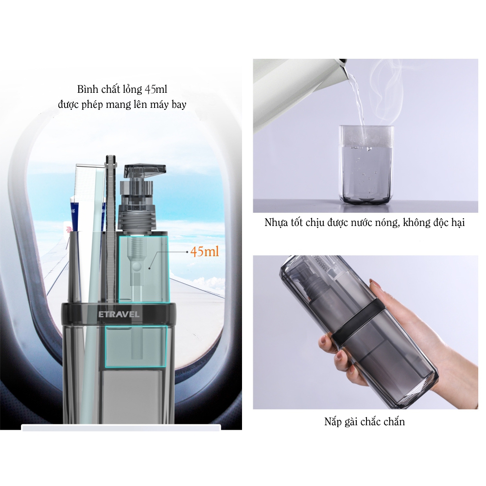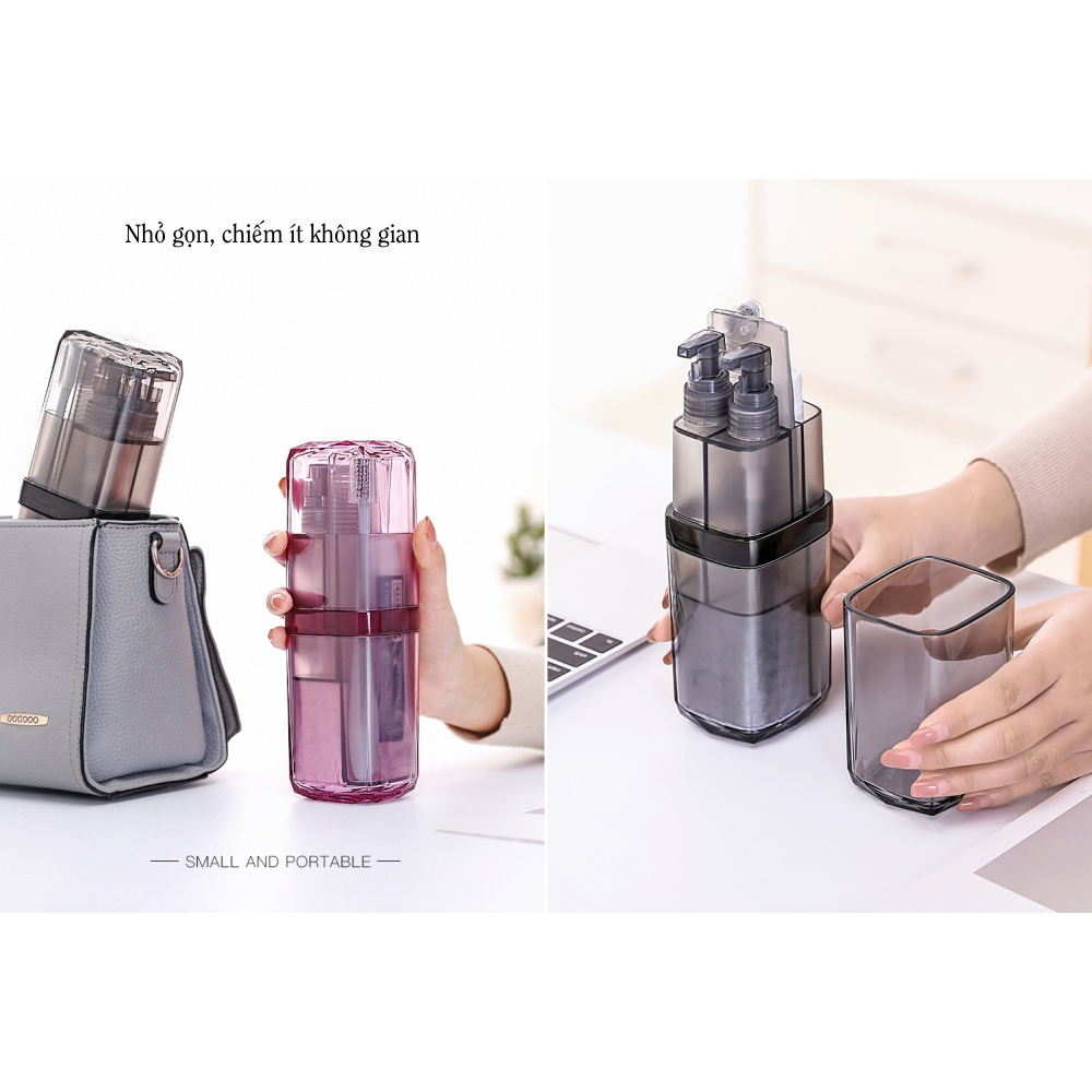 - Cốc du lịch được làm từ nhựa PP+ABS+PP nguyên sinh an toàn cho sức khỏe với thiết kế vô cùng tinh tế và tiện lợi gồm 2 ngăn đựng chất lỏng (sữa tắm, dầu gội), lược chải đầu, một ngăn chứa khăn mặt , ngăn đựng bàn chải và kem đánh răng nhỏ.