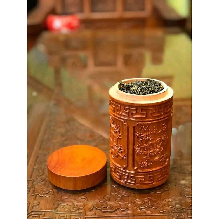 Hộp đựng chè trà trạm khắc nhiều hoa văn khắc nhau bằng gỗ hương đá kt cao 20×11,5cm