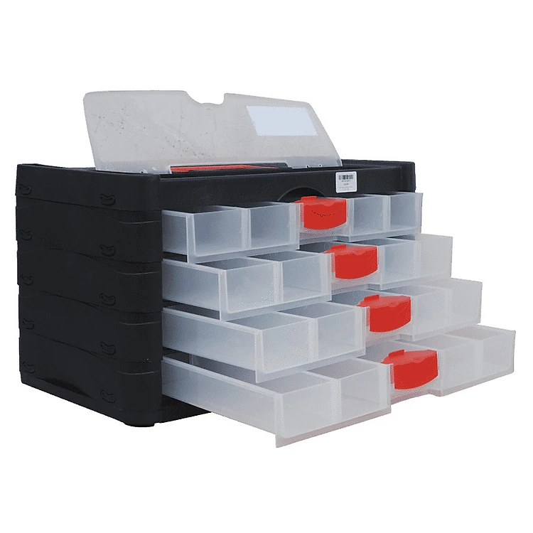 Hộp có rất nhiều khoang, gồm 1 khay trên và 4 tầng ngăn kéo với tay núm kéo, đẩy ra vào dễ dàng, mỗi ngăn kéo lại có nhiều ô ngăn nhỏ, giúp lưu trữ được nhiều loại linh kiện, cho người sử dụng tối ưu hóa việc phân loại sắp xếp các linh kiện nhỏ