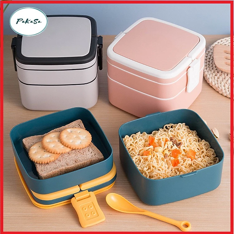 Hộp Đựng Đồ Ăn 2 Tầng 1000 ml Mẫu Vuông Kèm Muỗng Có Quai Xách PaKaSa - Hàng Chính Hãng