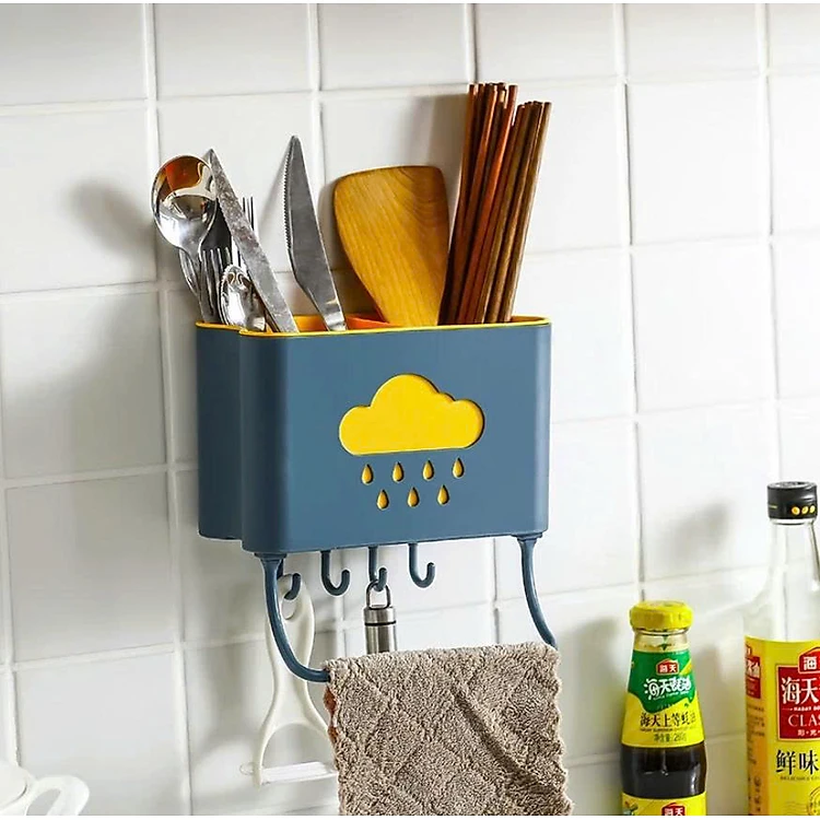 Hộp đựng đũa muỗng treo tường kèm móc treo khăn và dụng cụ bếp, ống đựng đũa muỗng hình đám mây