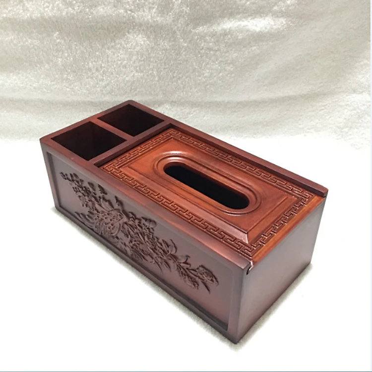 Hộp đựng giấy ăn gỗ hương đục chạm chim công ở thành.