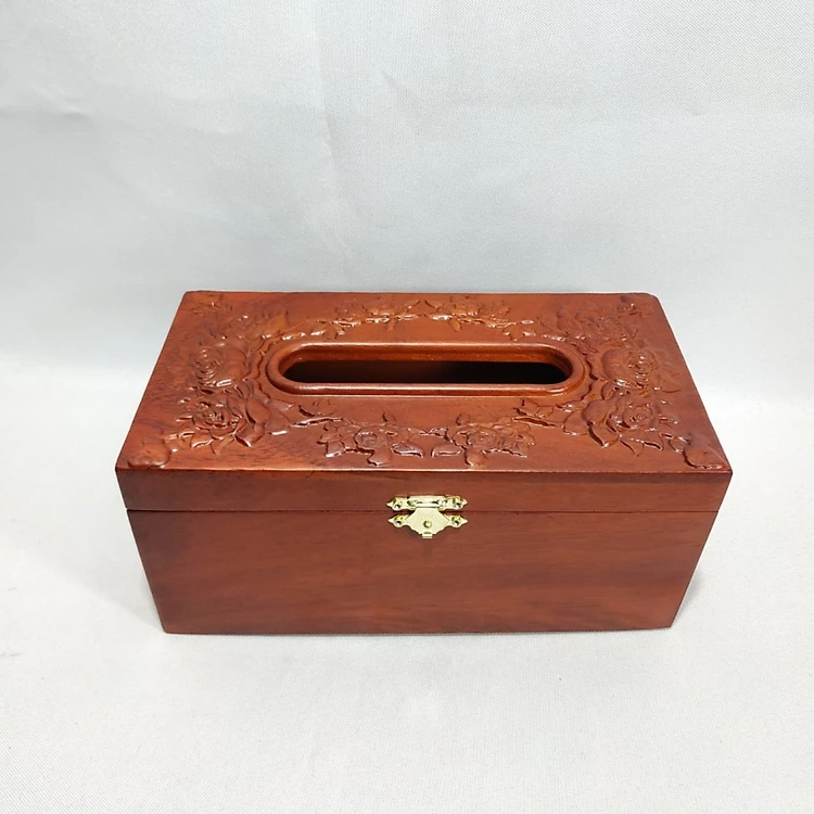 Hộp đựng giấy ăn gỗ hương đục chạm hoa hồng leo đẹp mắt