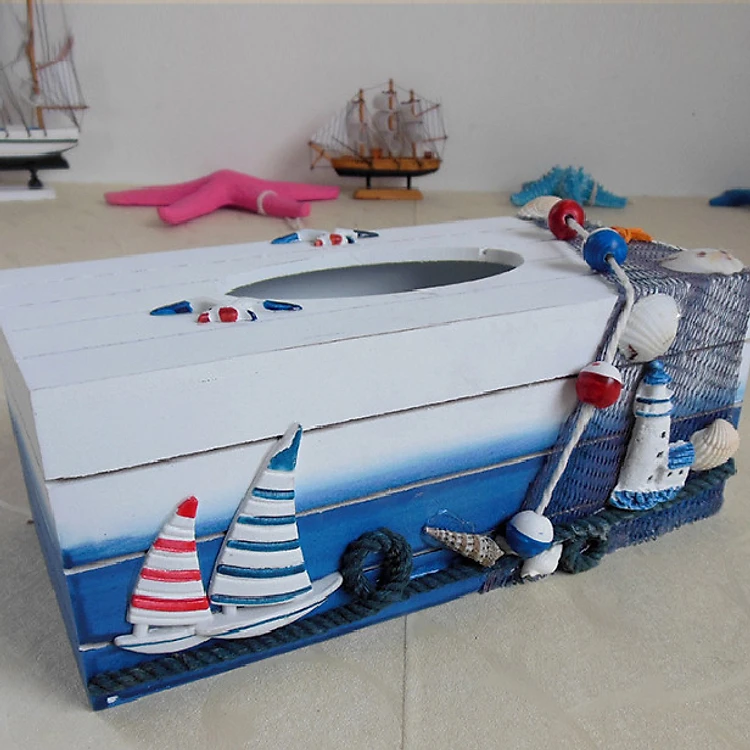 Hộp đựng khăn giấy, giấy ăn theo phong cách Địa Trung Hải với các trang trí hình Hải Âu, Thuyền buồm, Sao biển, Hải đăng, Mỏ neo lớ