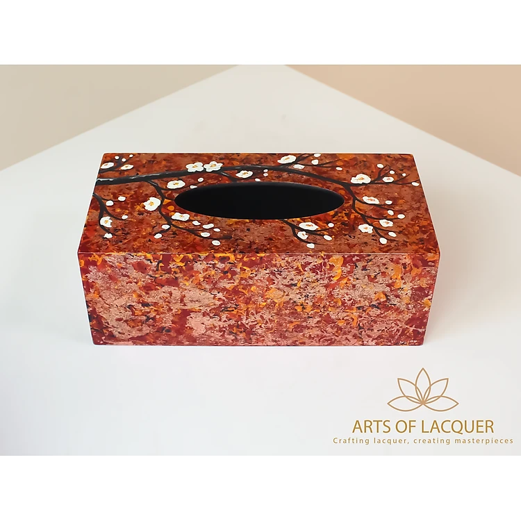 Hộp Đựng Khăn Giấy Sơn Mài Hoa Trắng trên Nền Màu Hổ Phách